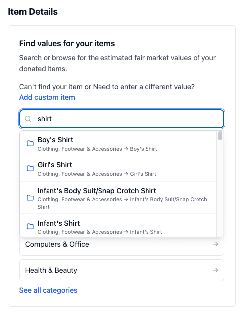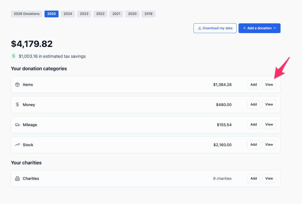 You can also use the search field to find the charity, the date, or the amount of the donation. (You can’t search on items in the donation, however)