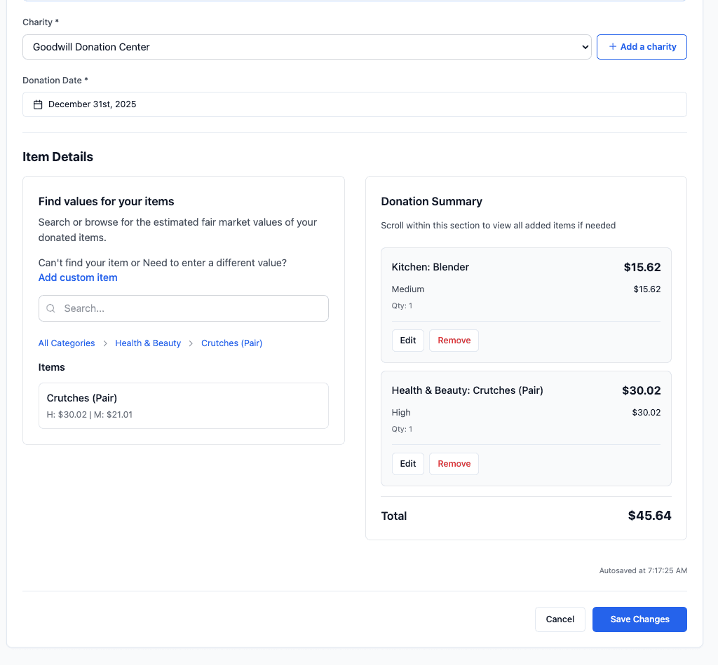 Now you can make changes to the item donation.