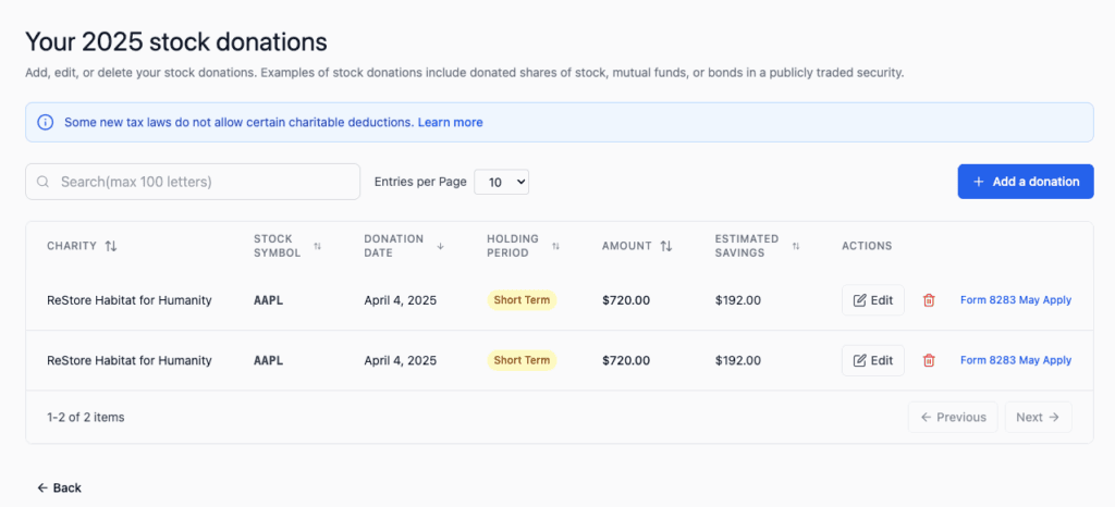 - Column headers – Sort by Charity, Stock Symbol, Donation Date, Amount, or Estimated Savings