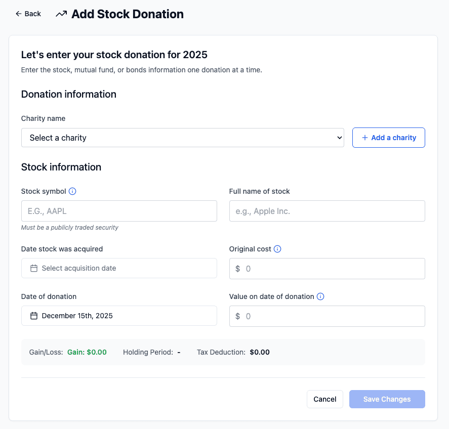 Stock is where you track donations of securities like individual shares of stock, mutual funds, bonds, or other investments. Donating stock instead of cash can be very tax-efficient!