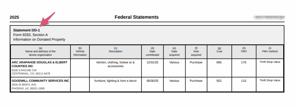 A typical summary report for Form 8283 might look like this–notice the statement number on the upper left. This will also be referenced in the filename as well!
