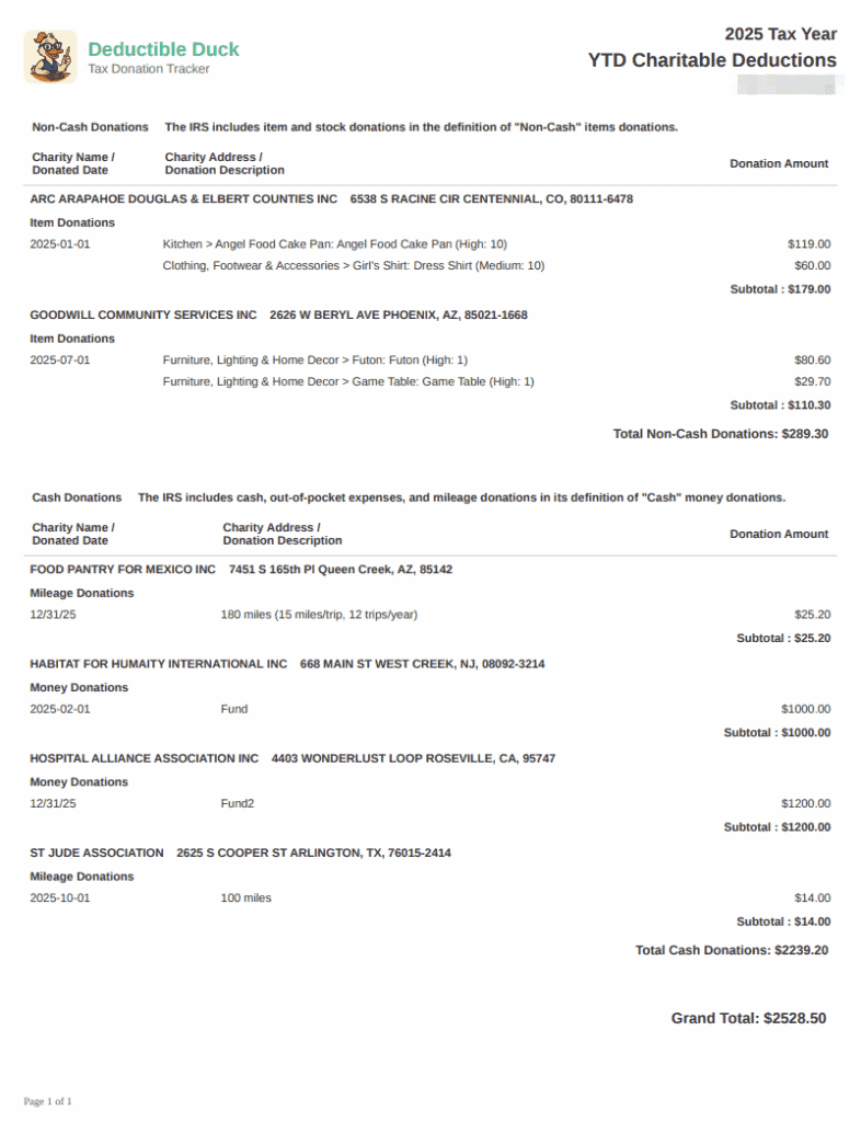 Deductible Duck will save your records for the last 7 years, so you’ll always have access to your donation history even after the current filing year.