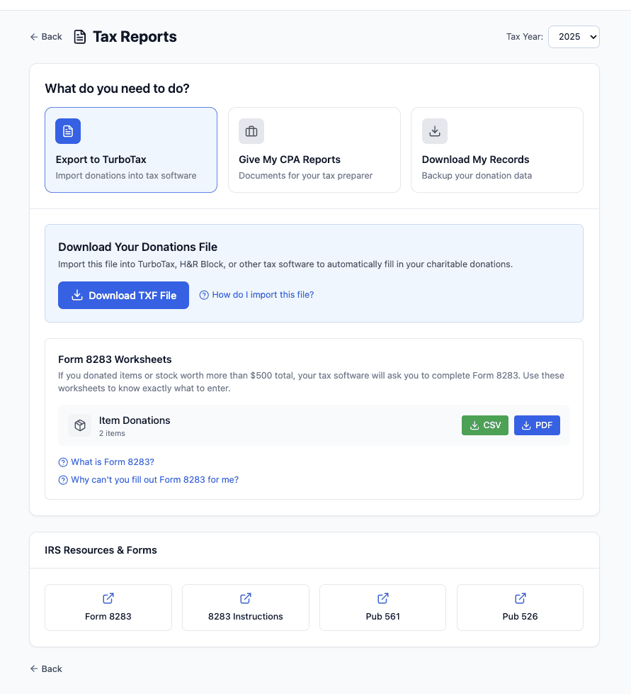 When you select Export to TurboTax, your donation data will be formatted specifically for TurboTax’s import process using a TXF file format. This lets you skip manually entering each donation and get them into your tax return with just a few clicks.