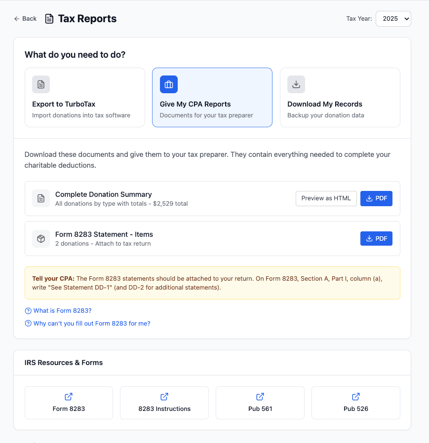 When you select this option, you’ll have access to multiple documents containing everything your CPA needs to complete your charitable deductions. There are two types of reports you can download–the Overall Donation Summary (one and only one) and the Form 8283 Summaries (one or more)