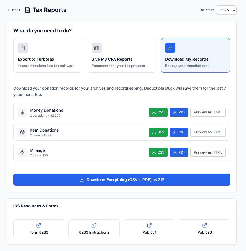 At the bottom of your records section, use the blue Download Everything (CSV + PDF) as ZIP button to get all your records in one convenient file. This gives you both formats for all donation categories packaged together.