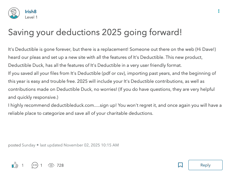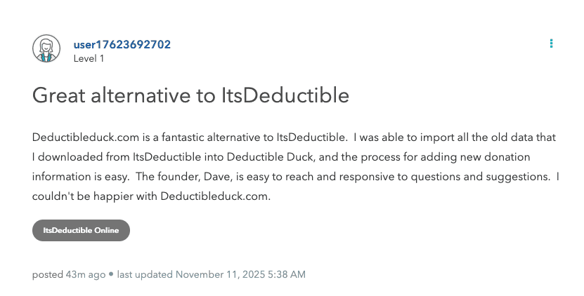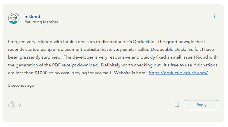 Everyone LOVES Deductible Duck! Raves & Love by Former ItsDeductible UsersI have been an ItsDeductible customer for many years and enjoyed the convenience and was very disappointed when it was announced that it was being discontinued. I looked into a new alternative, Deductible Duck, and found it to be very similar to ItsDeductible.